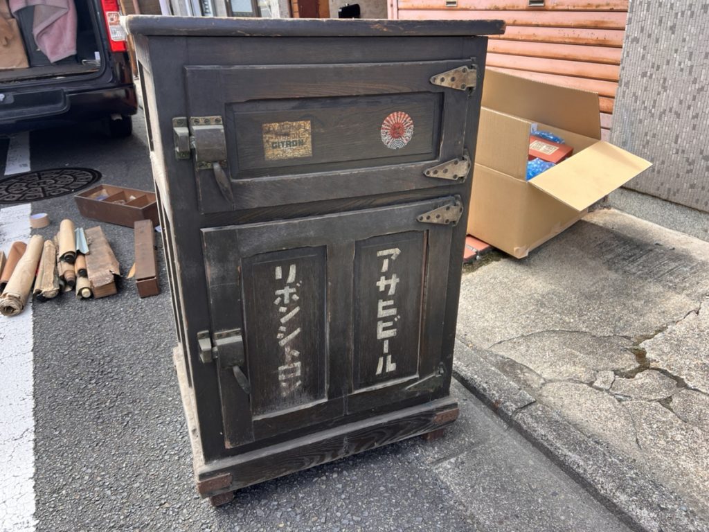 他の部屋や通路、水屋の中からも青貝の仕事の良い棚物や、針箱染付や印判の陶器類を見つける事ができ、面白いところでは大正期から戦前時のアサヒビールのロゴの入った氷冷蔵庫などもございました。
