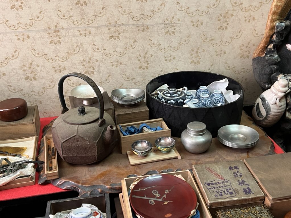 母屋の査定では、押入れの中や床の間に飾ってあった物などを拝見し、鉄瓶青磁の香炉銀製匙銀盃櫛カンザシ類蒔絵の銘々皿などの塗り物類、戦前の置き時計煎茶器揃、などなどをそれぞれ1点ずつ査定をしていきました。中でも、鉄瓶や、青磁の香炉、煎茶器の揃いなどは現在の人気や需要に重なり高価買取が出来ました。また、銀製の盃は以前では記念品として配られていた物の為、昔は単品では査定の対象外でしたが、現在は金銀製品の価格高騰に伴い、1点にて査定させて頂きました。