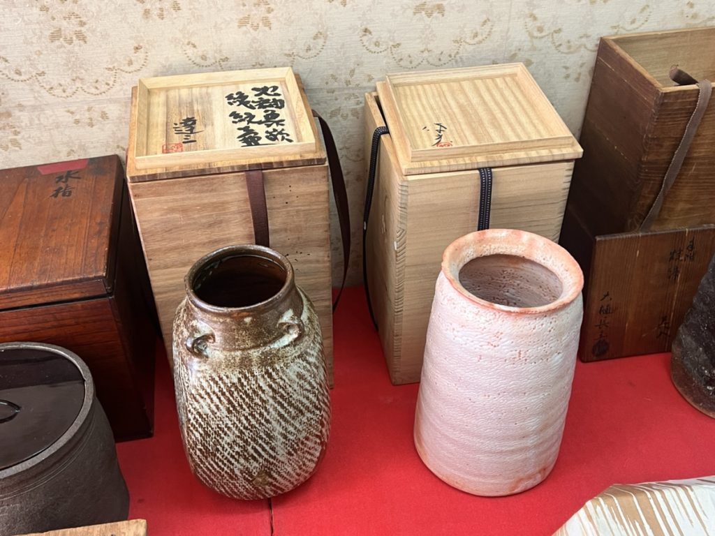 お品物を車から降ろして頂き、拝見いたしますと作家物の花入れや少し古い南蛮の水指や絵唐津の水指でした。