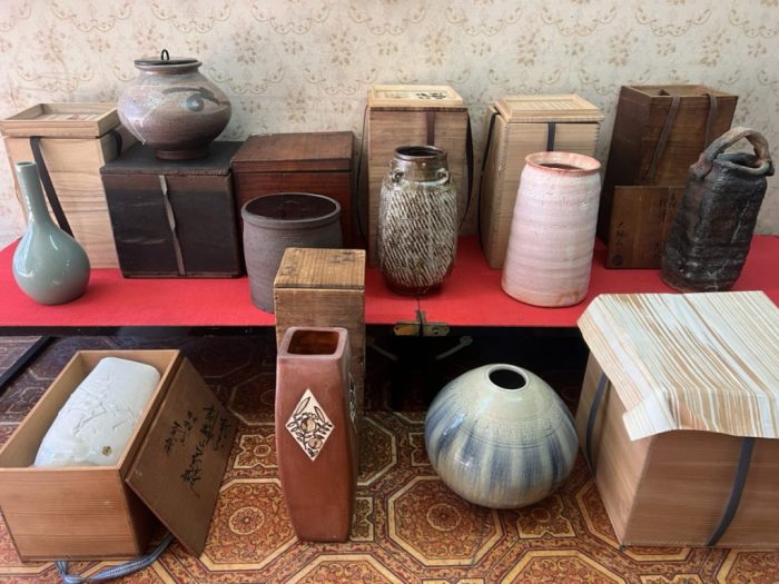 まず、作歌物の花入れでは益子焼人間国宝の島岡達三志野焼の名手の玉置保夫韓国人間国宝の柳海剛美濃焼加藤作助大樋焼大樋長寿などがございましたので、1点ずつ丁寧に拝見し、査定していきました。