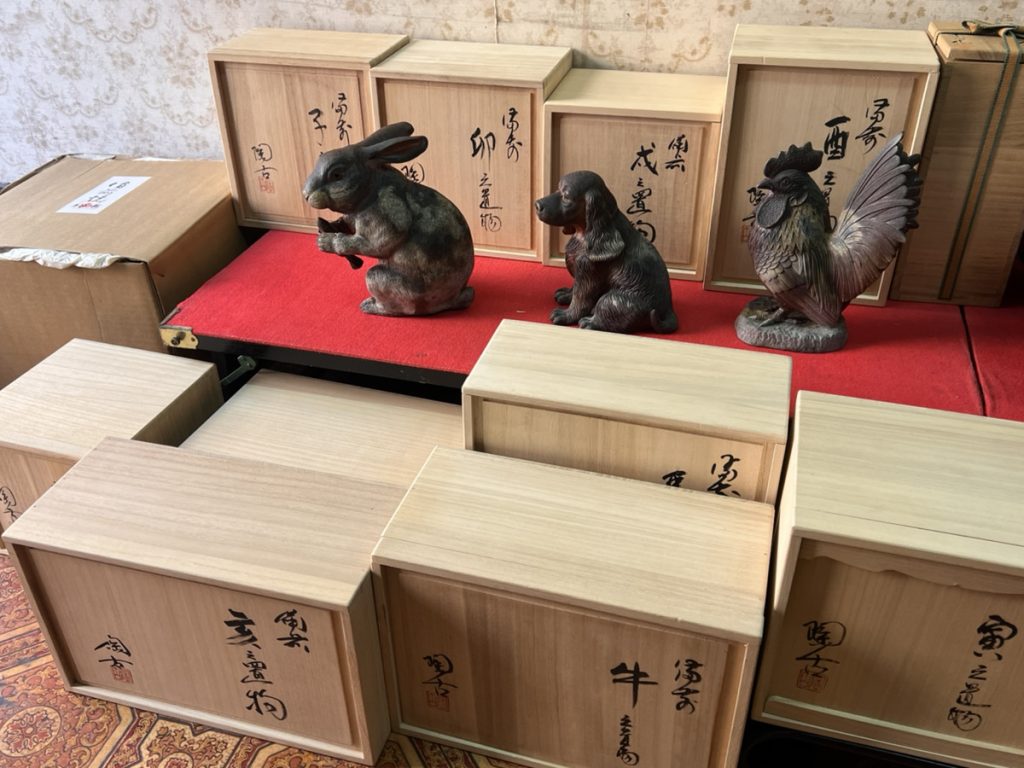 干支の作品はお茶道具でも多数あり、昔は人気の題材だったのですが、現在では12年間で一度しか出番がない事や、干支毎に置物などを飾られる風習が薄れてしまった事により、需要が低下してしまい、買取金額は安くなりがちです。しかしながら中身を確認いたしますと、昭和中後期の「いかにも干支の置物」と言う作風ではなく現代風にアレンジをした精巧な造りの物でした。また、猿以外の11体が揃っている点を評価し干支の置物としては高価買取金額を出せたと思います。