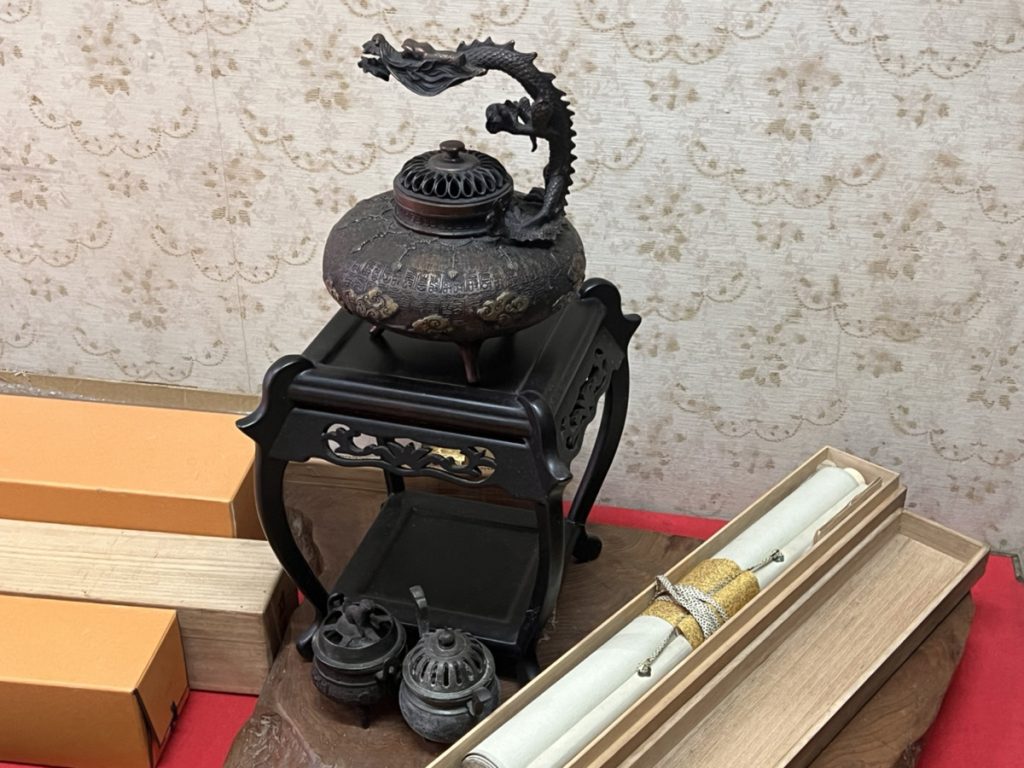 お客さまにご説明いたしますと「高いお金をかけて価値を低くしていたなんて・・・」と驚かれていましたが、思い入れのある数本を残し、心地よくほとんどの掛軸をお譲り頂く運びとなり、また最後には「この部屋の物でお値段が付くものがあれば・・・」と掛軸以外にも置物類などもお譲り頂ました、本当に有難うございます。