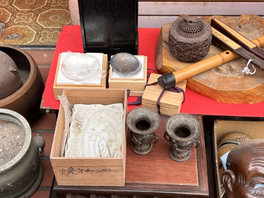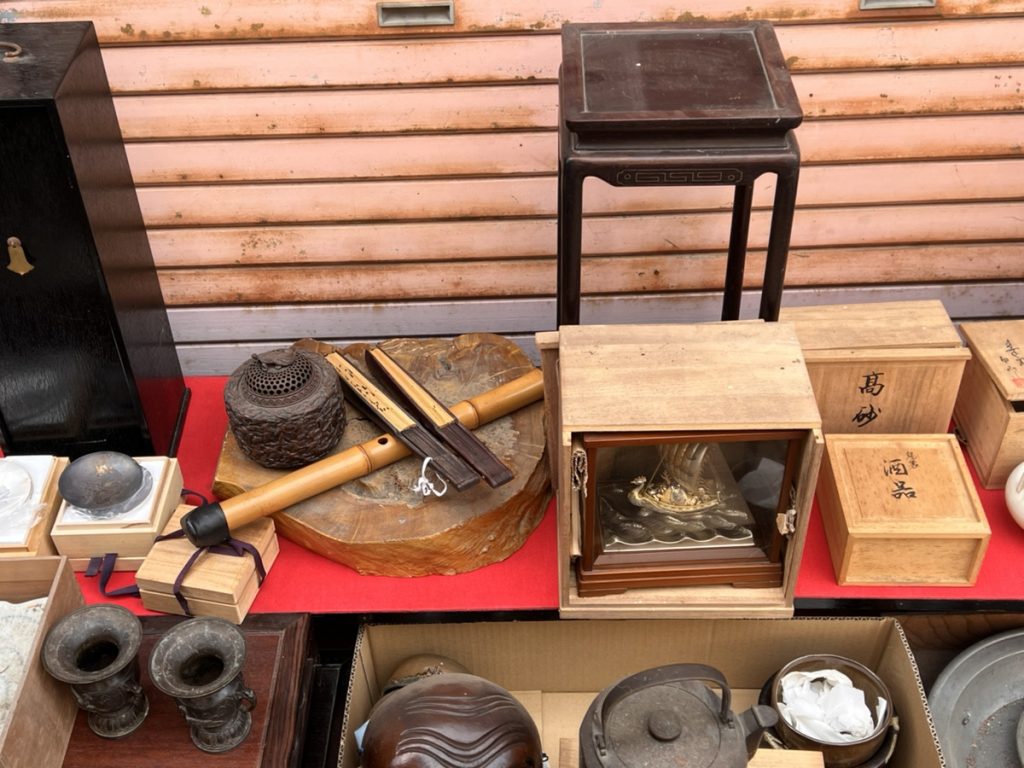 1点ずつお値段が付けれたお品物としては銀製(steriling silver)の舟の置物や銀杯、江戸時代後期~明治時代ぐらいの銅製の獅子の置物やその下の螺鈿細工(らでん)の高卓、銅製翁の置物、尺八、薄端(銅製花生)、香炉などなどで特に銀の舟や杯は現在、金銀製品の高騰により、以前はそんなに買い取れなかったのですが高価買取の対象となりました。また螺鈿細工の高卓は時代も古く仕事もよく骨董品に含まれるお品物でしたが、状態がかなり悪かったのが残念でしたが、現状品としてしっかりとお値段が付けれたと思います。