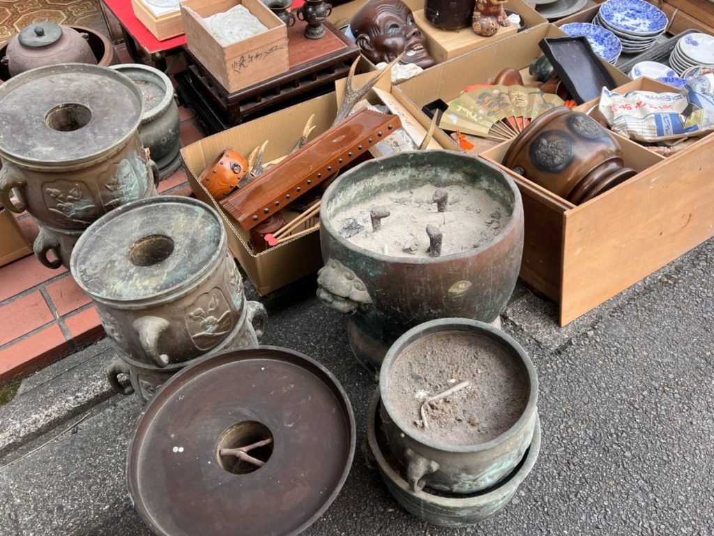 その後、お蔵の荷物を出していただいていた納屋の査定では明治期~昭和初期ぐらいの火鉢類や薄端、古皿類がありそれぞれ査定させて頂きました。イメージとしては火鉢類がこんなにたくさん残っているのにその上に乗せる鉄瓶が無かったのが残念で古い時代の鉄瓶では思いのほか高額で査定できるお品物もあります。